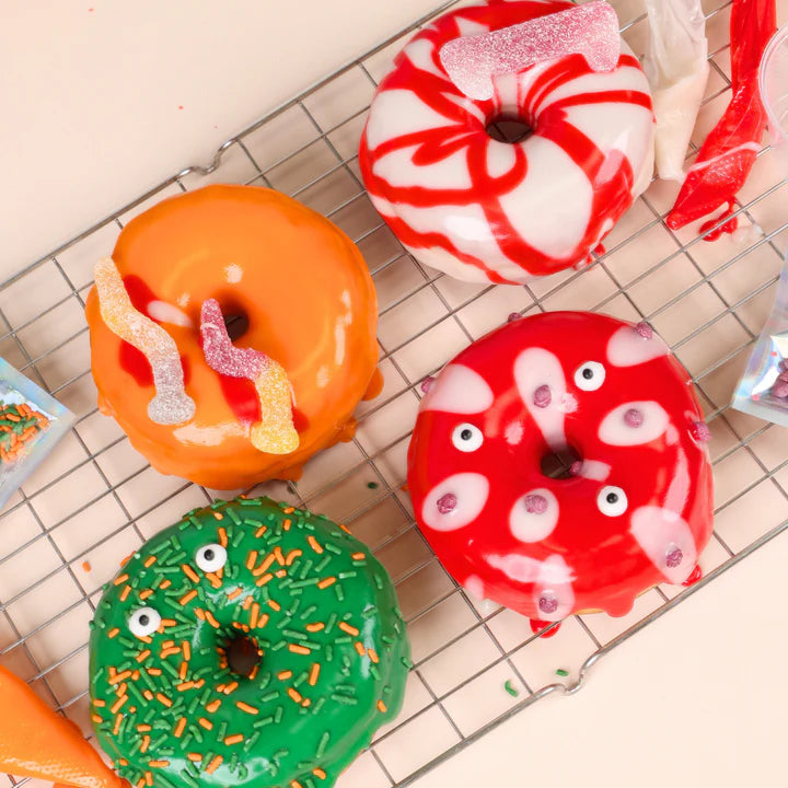 Décore tes beignets d'Halloween selon tes goûts, avec des garnitures colorées, des yeux effrayants et des extras sucrés ! 🎃 L'expérience DIY parfaite pour les enfants, les fêtes et les gourmands créatifs : délicieux, amusant et effrayant ! 🧁✨🍬